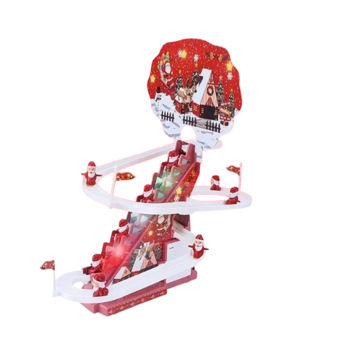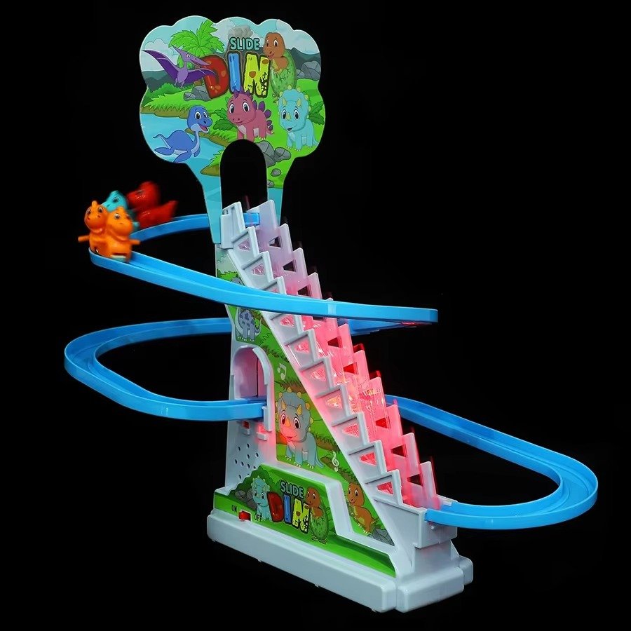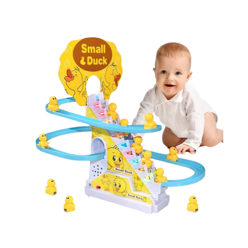 The Small Ducks Climbing Toys have: 9 little yellow ducks, Dinosaur or Santa Claus LED lighting effects, and ducks climbing stairs will be accompanied by music. There is a switch control; turn on the switch, and the ducks can climb the stairs independently. full of fun.